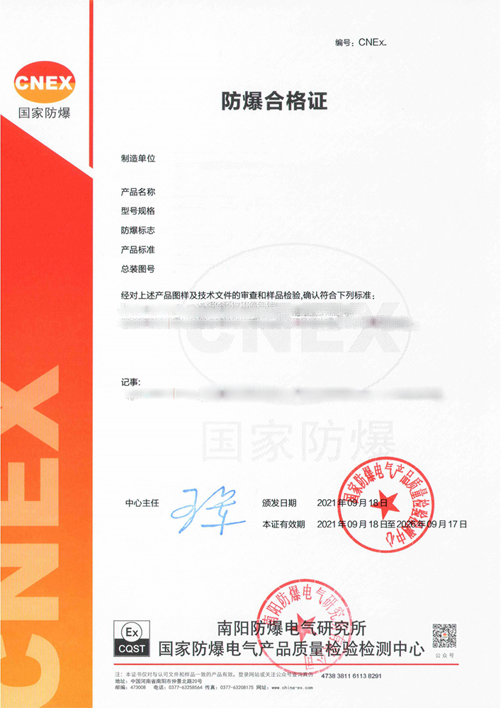 南陽(yáng)防爆研究所頒發(fā)的防爆合格證。